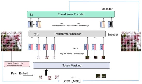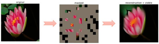 - He, K.; Chen, X.; Xie, S.; Li, Y.; Dollár, P.; Girshick, R. Masked autoencoders are scalable vision learners. In Proceedings of the IEEE/CVF Conference on Computer Vision and Pattern Recognition, New Orleans, LA, USA, 18–24 June 2022; pp. 16000–16009. [Google Scholar]