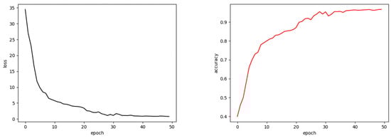 After training the MAE on the original Oxford 102 Flowers dataset, this chapter describes the removal of the decoder component, retaining only the encoder for flower feature extraction. Subsequently, a simple fully connected layer follows the encoder to classify flower images, demonstrating the encoder’s robust feature extraction capabilities. To this end, techniques such as random cropping, random flipping, and grayscale transformations were applied to augment the original Oxford 102 Flowers dataset. The weights of the encoder were frozen, and only 50 training epochs were conducted on the fully connected layers. Setting the learning rate to 0.0001 and batch size to 256, Figure 9 illustrates the change curves for the classification loss function (left) and accuracy (right) for flower images. It was observed that after 35 training epochs, both the learning rate and accuracy converged.