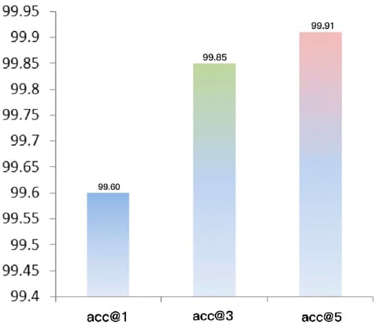 Meanwhile, we calculated accuracy at 1 (acc @ 1), accuracy at 3 (acc @ 3), and accuracy at 5 (acc @ 5) for the flower classification model; the training results are presented in Figure 10. Among these, accuracy at 1 (acc @ 1) refers to the accuracy of the first prediction in each batch, indicating the model’s ability to correctly identify the primary category. Accuracy at 3 (acc @ 3) and accuracy at 5 (acc @ 5) denote the model’s accuracy for the top three and top five predictions in each batch, respectively. These metrics are particularly useful for evaluating the accuracy of classification models with numerous categories, such as this dataset, which contains 102 categories.