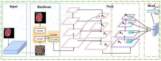 In this section, the encoder obtained from the MAE pre-trained model replaces the Backbone component of YOLOv5 for feature extraction from flower images. Figure 13 illustrates the integration of the MAE and YOLOv5 in our proposed model, enhancing feature extraction in flower image detection. In this innovative approach, the backbone of YOLOv5, traditionally responsible for initial feature extraction, is substituted with the encoder from a pre-trained MAE. This encoder, pre-conditioned on a flower-specific dataset, harnesses the powerful representational capabilities of the ViT-Large architecture. The extracted features are then propagated through the Neck, comprising a series of processing layers designed to spatially refine these features before prediction. Subsequently, the refined features enter the Head of the model, which utilizes Non-Maximum Suppression (NMS) to discern the most probable bounding boxes from an array of candidates, outputting a matrix with dimensions 7 × 7 × 23. This matrix includes class probabilities, bounding box coordinates, and objectness scores. Adjustments to the position offsets within the candidate boxes are made to enhance the precision of the final object detection.