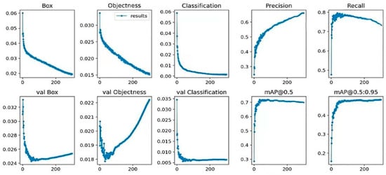Figure 14 illustrates a multi-faceted evaluation of the object detection model across several metrics over 300 epochs. In the top row, the ‘Bounding Box’, ‘Objectness’, and ‘Classification’ loss curves reveal an overall descending trend, which indicates a progressive refinement in the model’s ability to accurately predict bounding boxes, discern objects from background noise, and correctly classify detected objects. Notably, the ‘Bounding Box’ and ‘Classification’ losses demonstrate a steady decline, while the ‘Objectness’ loss relatively plateaus, which suggests that the model quickly learns to differentiate objects from the background, with further improvements primarily in bounding box regression and classification accuracy.