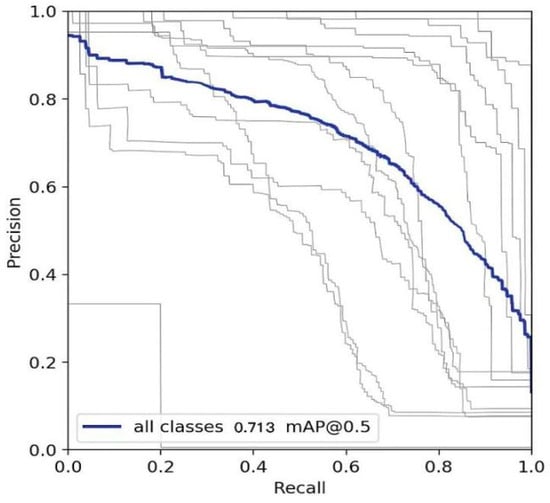 Precision and recall are commonly used to evaluate a model’s performance. The area under the P–R curve represents the average precision (AP), with a larger area indicating better model performance. After experimenting with the flower object detection method based on the MAE on a self-built flower dataset, the P–R curve shown in Figure 15 was obtained, with an average mAP@0.5 of 71.3% for all classes.
