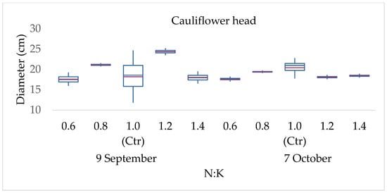 Wadan et al. [] further reported that fertilizer levels of 120 kg ha−1 N plus 90 K kg ha−1 substantially enhanced yield performance in terms of head weight and diameter and leaf area. The latter finding indicates that the appropriate N:K ratio is crucial to achieve optimal growth and head size in cauliflower production.