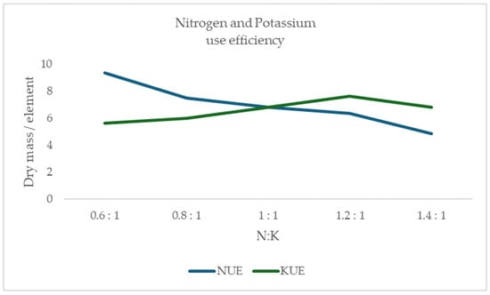 Nitrogen use efficiency (NUE) and potassium use efficiency (KUE) in relation to N:K.