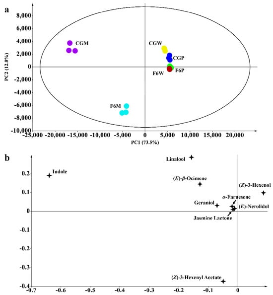 Principal component analysis of aroma components of Fuyun No. 6 (F6, camellia sinensis) and Chungui (CG, camellia sinensis) varieties before and after mechanical stress. (a) Principal component analysis plot and (b) the loading plot of samples’ key volatiles before and after mechanical stress. CGP = CG plucked leaves, F6P = F6 plucked leaves, CGW = CG withered leaves, F6W = F6 withered leaves, CGM = leaves of CG after mechanical stress, and F6M = leaves of F6 after mechanical stress.
