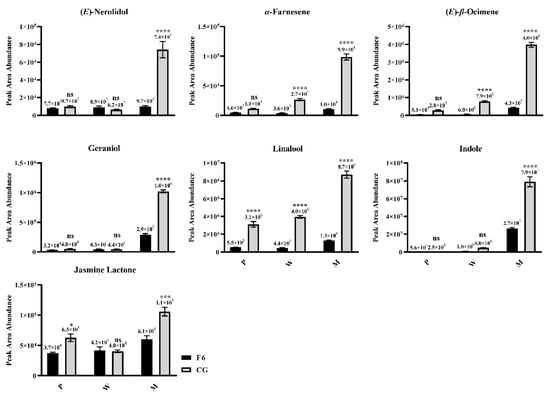 Key aroma contents in Fuyun No. 6 (F6, camellia sinensis) and Chungui (CG, camellia sinensis) varieties before and after mechanical stress. P = plucked leaves, W = withered leaves, M = after mechanical stress leaves. ‘ns’ represents non-significant association; ‘*’ represents p < 0.05; ‘***’ represents p < 0.001; ‘****’ represents p < 0.0001.