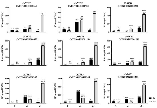 Studies have proved that (E)-nerolidol, α-farnesene, β-ocimene, indole, and jasmine lactone formation are controlled by (E)-nerolidol synthase, α-farnesene synthase, β-ocimene synthase tryptophan synthase β-subunit, and 9-lipoxygenase 1 [21,22,23,24,25,26]. In this study, two (E)-nerolidol synthase genes (CsNES1, CsTGY08G0000361 and CsNES2, CsTGY08G0001705), two α-farnesene synthase genes (CsAFS1, CsTGY08G0000370 and CsAFS2, CsTGY08G0000372), two β-ocimene synthase genes (CsOCS1, CsTGY05G0001284 and CsOCS2, CsTGY05G0001285), two tryptophan synthase β-subunit 2 genes (CsTSB2a, CsTGY08G0000242 and CsTSB2b, CsTGY08G0000243), and one lipoxygenase gene 1 (CsLOX1: CsTGY03G0001273) were found to be differentially expressed between CGM and F6M. The expression levels of these genes and corresponding aromas were all continuous and significantly increased after withering and mechanical stress in CG cultivars (Figure 3). Although these genes were also more highly expressed in F6 after withering and mechanical stress, the increase was significantly lower than that in CG (Figure 3). However, the expression levels of CsNES1, CsNES2, CsTSB2a, and CsTSB2b in F6M were significantly lower than those in F6W. The expression trends of the partial key genes mentioned above were further verified by qRT-PCR analysis (Figure S3).