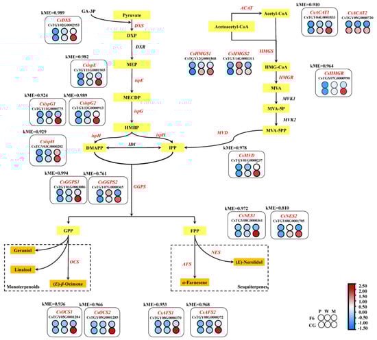(E)-nerolidol, α-farnesene, β-ocimene, linalool, and geraniol belong to sesquiterpenoids or monoterpenes volatiles, and form from mevalonate (MVA) or methylerythritol phosphate (MEP) pathways. From the differentially expressed genes (DEGs) of F6M and CGM, two acetyl-CoA C-acetyltransferase genes (CsACAT1, CsTGY04G0001833 and CsACAT2, CsTGY05G0000720), two hydroxymethylglutaryl-CoA synthase genes (CsHMGS1, CsTGY12G0001868 and CsHMGS2, CsTGY14G0001311), one hydroxymethylglutaryl-CoA reductase gene (CsHMGR, CsTGY07G0000990) and one diphosphomevalonate decarboxylase gene (CsMVD, CsTGY01G0000237) were found to be significantly more highly expressed in CG (Figure 4).