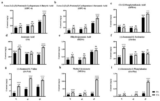 Contents of (a) 3-oxo-2-(2-(Z)-Pentenyl) Cyclopentane-1-Butyric acid (OPC-4), (b) 3-oxo-2-(2-(Z)-Pentenyl) Cyclopentane-1-hexanoic acid (OPC-6), (c) Cis-12-Oxophytodienoic Acid (OPDA), (d) Jasmonic Acid, (e) Dihydrojasmonic acid (H2JA), (f) Jasmonoyl-L-Isoleucine (JA-Ile), (g) N-[(-)-jasmonoyl]-(L)-Valine (JA-Val), (h) Methyl Jasmonate (MeJA), (i) N-[(-)-Jasmonoyl]-(L)-Phenalanine (JA-Phe) in Fuyun No. 6 (F6, Camellia sinensis) and Chungui (CG, Camellia sinensis) varieties before and after mechanical stress. ‘ns’ represents non-significant association; ‘*’ represents p < 0.05; ‘**’ represents p < 0.01; ‘***’ represents p < 0.001; ‘****’ represents p < 0.0001.