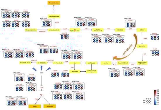 The enrichment of F6M and CGM DEGs from the Kyoto Encyclopedia of Genes and Genomes (KEGG) showed that the α-linolenic acid (ALA) metabolism pathway and plant hormone signal transduction play different roles in aroma accumulation regulation in different tea varieties (Figure S4). ALA, one type of important plant phytohormone, is the main synthetic pathway of JAs, and can regulate the biosynthesis of volatiles and act as an upstream signal in plants like tea [30].