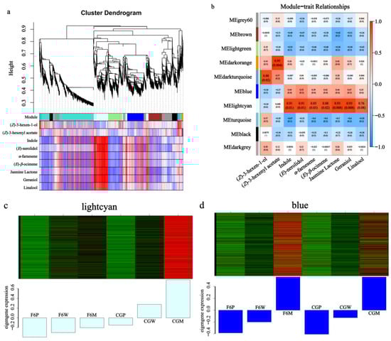 The co-expression network of DEGs and key aromas in Fuyun No. 6 (F6, camellia sinensis) and Chungui (CG, camellia sinensis) varieties before and after mechanical stress. (a) The hierarchical clustering tree of WGCNA. The colored boxes below represent genes with similar expression patterns. The red and blue boxes below represent the correlation between aroma and color modules. Red color indicates high correlations and blue indicates low correlations. (b) The heat map of nine aroma components with each module. Red color indicates high correlations and blue indicates low correlations. (c,d) The DEGs’ expression level in different samples of the lightcyan and blue modules.