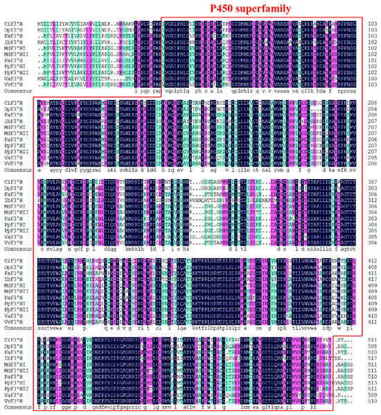Two cDNAs containing the complete coding region, PpF3′HI (GenBank accession no. MF614141) and PpF3′HII (GenBank accession no. MF614142), were isolated from the red Chinese sand pear cv. ‘Mantianhong’. The coding sequence of PpF3′HI spans 1542 bp, while PpF3′HII measures 1536 bp in length. These coding regions encode proteins comprising 514 amino acids for PpF3′HI, and 512 amino acids for PpF3′HII. PpF3′HI shares 95% of its amino acid sequence identity with PpF3′HII, and PpF3′HI and PpF3′HII share 98% of their amino acid sequence identity with MdF3′HI and MdF3′HII in apples, respectively. A highly conserved P450 superfamily domain (accession no. cl12078) was found both in PpF3′HI and in PpF3′HII (Figure 1). Phylogenetic analysis was conducted utilizing the amino acid sequences deduced from genes encoding flavonoid hydroxylase in pears and diverse plant species. This analysis yielded two distinct clades, labeled as the F3′H and F3′5′H clades. Notably, PpF3′HI and PpF3′HII were grouped together with their respective counterparts, MdF3′HI and MdF3′HII, within these clades (Figure 2).