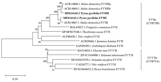 The PpF3′HI and PpF3′HII cloned in this study share a P450 superfamily domain (Figure 1) and belong to the cytochrome P450 protein (P450) superfamily, a huge class of heme-containing oxidases catalyzing NADPH- or NADH-dependent oxygenation reactions on a wide range of substrates [29,30,31]. The F3′H is grouped into the CYP75 family, which is part of the CYP71 clan of P450s that participates in the synthesis of phenylpropanoids, flavonoids, isoflavonoids, alkaloids, and other secondary compounds [32]. Phylogenetic analysis revealed distinct clustering of all F3′Hs and F3′5′Hs into two separate clades, as follows: the CYB75B gene subfamily, encoding F3′Hs, and the CYB75A subfamily, encoding F3′5′Hs (Figure 2). Catalyzing hydroxylation at different positions of the B-ring of the flavonoid molecule, F3′H and F3′5′H generate 3′,4′- and 3′,4′,5′-hydroxylated flavonoids, respectively. Compared to 3′,4′-hydroxylated flavonoids, 3′,4′,5′-hydroxylated flavonoids are not ubiquitous in either lower or higher plants, indicating that the F3′5′H gene was inactivated or lost several times during evolution [10]. According to the analysis of components and contents of anthocyanin in 37 cultivars of red-skinned pear fruit, derivatives of the 3′,4′-hydroxylated cyanidin are the major components of anthocyanin in red-skinned pear, while derivatives of 3′,4′,5′-hydroxylated delphinidin were not detected [33]. Therefore, the existence of F3′H and the loss of the F3′5′H gene in pears, found in this study, revealed in a genetic context that the B-ring of DHK in pears can only be hydroxylated at the 3′ position but not at both the 3′ and 5′ positions, finally leading to the production of only cyanidin-based, but not delphinidin-based, pigments in pears.