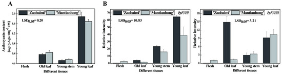 A higher expression level of PpF3′HI was detected in young tissues of two cultivars, including young leaves and stems, than in old tissues (Figure 3B). PpF3′HII was most expressed in old and young leaves of ‘Zaobaimi’, and in young leaves of ‘Mantianhong’ (Figure 3B). Additionally, both PpF3′HI and PpF3′HII showed a low expression level in mature flesh of two cultivars (Figure 3B).