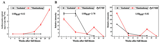 Anthocyanin accumulation started at 15 WAFB in ‘Mantianhong’, and peaked until harvest (22 WAFB), with 4 mg 100 g−1, while no anthocyanin was detected in ‘Zaobaimi’ throughout the development stage (Figure 4A). Regarding gene expression, both PpF3′HI and PpF3′HII showed two peaks in ‘Mantianhong’; one was detected in fruitlets (5 WAFB), and the other one occurred in the middle of the period of red coloration (Figure 4B). In the white-skinned cultivar ‘Zaobaimi’, the expression of PpF3′HI and PpF3′HII peaked in fruitlets and subsequently decreased during development (Figure 4B).