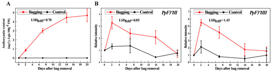 Anthocyanin accumulation (A) and expression of PpF3′HI and PpF3′HII (B) under bagging treatment conditions in ‘Mantianhong’. Data are presented as the mean ± standard error of three biological replicates.