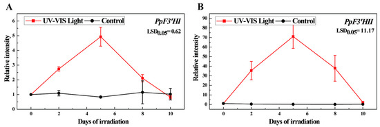 Expression of PpF3′HI (A) and PpF3′HII (B) under postharvest UV-B/visible irradiation conditions for ‘Mantianhong’. Data are presented as the mean ± standard error of three biological replicates.