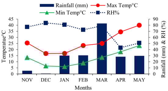 Accessions were sown in rows, with row-to-row distances of 45 cm and plant-to-plant distances of 15 cm, respectively. Pre-emergence herbicide (Dualgold) with S-metolachlor (C15H22ClNO2) as an active ingredient was applied at a dosage of 1976 mL ha−1 after 10 h of planting. However, a full dose and a half dose of 125 kg ha−1 diammonium phosphate (DAP) and urea, respectively, were used at sowing time, whereas the remaining urea was given at first irrigation (40 DAS) and second irrigation (at flowering). Soil analysis and weather variables were recorded during the study period (Table 1; Figure 2). Phenological traits, growing degree days, agronomic traits, and oil traits were noted thorough standard methodology.