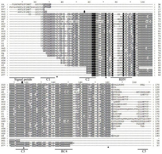 Amino acid sequence structures of 30 S-RNase genes. Conserved residues are located in the black area and dashes indicate gaps. The asterisk represents a difference of 10 residues from the previous number. The signal peptide region (SP), conserved regions (C1, C2, C3, RC4, and C5), and the hypervariable region (RHV) are underlined. The two histidine residues essential for RNase activity are labeled with the symbol ↓, and the four conserved cysteine residues are labeled with the symbol ▲. To distinguish the two S6s, S6* stands for Prunus webbii S6.