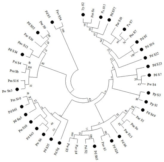 Phylogenetic tree of 50 S-RNase genes in the Prunus L. genus. Pd: Prunus dulcis; Pw: Prunus webbii; Pp: Prunus persica; Pc: Prunus cerasifera; Psa: Prunus salicina; Par: Prunus armeniaca; Pav: Prunus avium; Psi: Prunus simonii; Pm: Prunus mume. Those marked with circles are the S-RNase genes in the test.