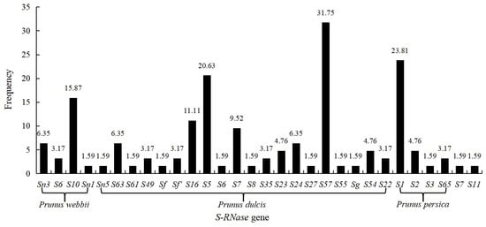 Among the 30 S-RNase gene fragments amplified from 65 germplasm resources, the highest gene frequency of S57-RNase was 31.75%, which was amplified from 20 cultivars. The frequencies of S1-, S5-, S7-, S10-, and S16-RNase are relatively high, ranging from 9.52% to 23.81%. The gene frequency of the remaining S-RNases ranged from 1.59% to 6.35%, appearing 1–4 times (Figure 4). The results also showed that high-frequency genes were commonly present in the seven main almond cultivars in Xinjiang, including ‘Zhipi’ Sn3S57, ‘Shuangguo’ S5S35, ‘Shuangruan’ Sn5S63, ‘Aifeng’ Sn3S23, ‘Wanfeng’ S5S7, ‘Yingzui’ Sn3S1, and ‘Yeerqiang’ S5S57. This resulted in different cultivars having the same S-RNase gene or even the same S genotype, which may be due to long-term natural selection or purposeful breeding by humans.
