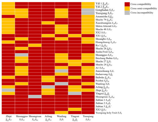 According to the principle of S genotype incompatibility, if the hybrid parent shares the same S genotype, the hybrid is incompatible. If the S genotype of the hybrid parent contains one identical S gene, the hybrid is semi-compatible. When the S genotype of the hybrid parent is completely different, the hybrid is compatible. A database of almond hybrid incompatibility can be constructed based on this principle. Additionally, an analysis of hybrid incompatibility/compatibility between seven main almond varieties planted in Xinjiang and 35 other varieties was conducted. This analysis provides a reference basis for selecting parents in production and breeding.