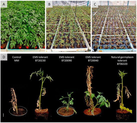 Some of the tolerant lines identified as part of our study displayed a compact phenotype. Previous works have reported this trait’s occurrence, probably as a resource to reduce water evaporation to cope with abiotic stress conditions [21]. This is the case of the EMS heat-tolerant mutant line HT7, obtained from the ornamental Micro-Tom genetic background, which shows a compact phenotype as described by Pham et al. [22]. HT7 plants developed a narrow canopy and had less stomatal density than WT plants under stress conditions, which could contribute to a decreasing transpiration rate. Furthermore, HT7 plants produced a high number of viable pollen grains under long-term heat stress, resulting in high fruit-setting rates and increased fruit yield [22]. In our mutant collection, some tolerant lines, such as BT20090 (Figure 1D), exhibited compact vegetative growth when subjected to combined heat and drought stresses in nursery greenhouse conditions, which supports the idea that this strategy is effective for mitigating adverse climatic conditions.