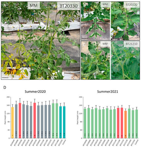 Vegetative traits screened during the summer2020 and summer2021 greenhouse trials. After three weeks of combined drought and heat stress conditions, Moneymaker control plants (MM) show reduced pant growth and evident symptoms of chlorosis when compared to tolerant accessions like BT20330 (A). Also, while leaflets of tolerant lines were fully open, in control plants they appeared raised upward on the adaxial side (B). Blazing and leaf damage were characteristic of the apical region of MM plants, but these symptoms were absent in tolerant lines (C). (D) Plant height was analyzed by one-way ANOVA with Tukey’s HSD post hoc test for the detection of homogeneous groups (significant differences at p < 0.05). Different lowercase letters indicate significant differences among the genotypes. Scale bars correspond to 5 cm (A–C).