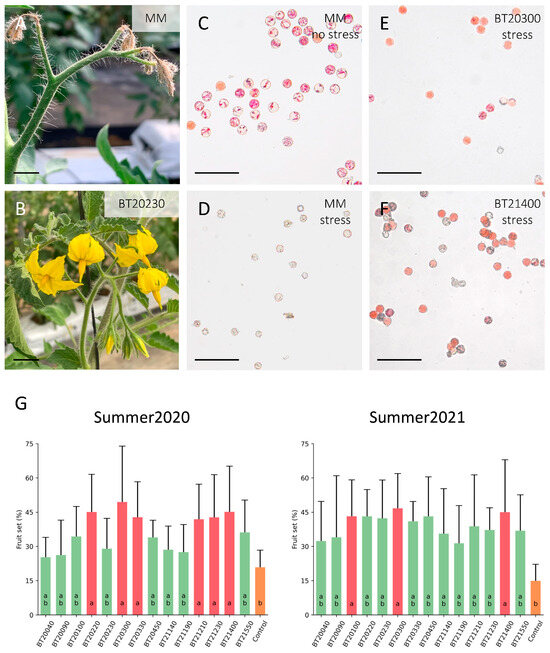 Reproductive traits screened during the summer2020 and summer2021 greenhouse trials. Three weeks after stress conditions were applied, the flowers of control Moneymaker (MM) plants exhibited inflorescence, with flowers showing signs of burning and abortion (A). In contrast, tolerant lines like BT20230 showed no damage to their flowers (B). Tetrazolium staining assays proved that pollen viability is severely affected in control plants subjected to stress conditions (D) compared to control conditions (C). Stress does not affect the pollen viability of tolerant accessions like BT20300 (E) and BT21400 (F). (G) Fruit setting percentage was analyzed by one-way ANOVA with Tukey’s HSD post hoc test for the detection of homogeneous groups (significant differences at p < 0.05). Different lowercase letters indicate significant differences among the genotypes. Scale bars correspond to 1 cm in (A,B) and to 100 μm in (C–F).