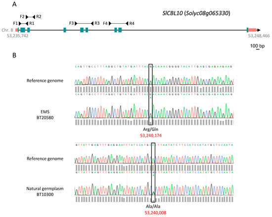 Single nucleotide variant detection by TILLING and EcoTILLING analysis of the SlCBL10 gene. (A) Genomic organization of the SlCBL10 (Solyc08g065330) gene. Coding exons are depicted as green boxes, introns as black lines, and 5′ and 3′ UTR regions as pink boxes. Chromosomic coordinates are also included, as is amplicon location. (B) Single nucleotide variants detected by means of High Resolution Melting (HRM) analysis were confirmed by Sanger sequencing in homozygosis in the EMS BT20580 line as well as in heterozygosis in the natural germplasm BT10300 accession.