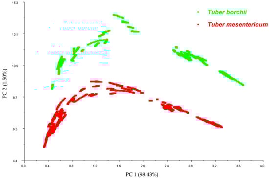 Principal Component Analysis was implemented as a data pattern recognition technique to reduce the dimensionality of the data set and to investigate the ability of the E-nose to discriminate between the two truffle species. The resulting PCA observation plot of the first two principal components illustrates distinct clusters corresponding to T. mesentericum and T. borchii, with the first principal component explaining 98% of the variance (Figure 1). The E-nose provided good discrimination between Tuber mesentericum and Tuber borchii. The species is known to be one of the primary factors influencing the profile of volatile compounds and the aroma of truffles [2], supporting our findings.