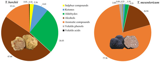 In T. mesentericum, 3-methylanisole was the most abundant VOC, responsible for a floral aroma (Table 2). This compound has been identified as one of the most abundant VOCs in black truffles [26]. Consistently with our results, Schmidberger and Schieberle [25] observed a higher quantity of volatile aromatic compounds in black truffles bringing typical floral, spicy, and nutty odours. On the other hand, 8-carbon chain alcohols prevailed in T. borchii, characterised by a mushroom and earthy odour, with 1-octen-3-ol as the most abundant one.