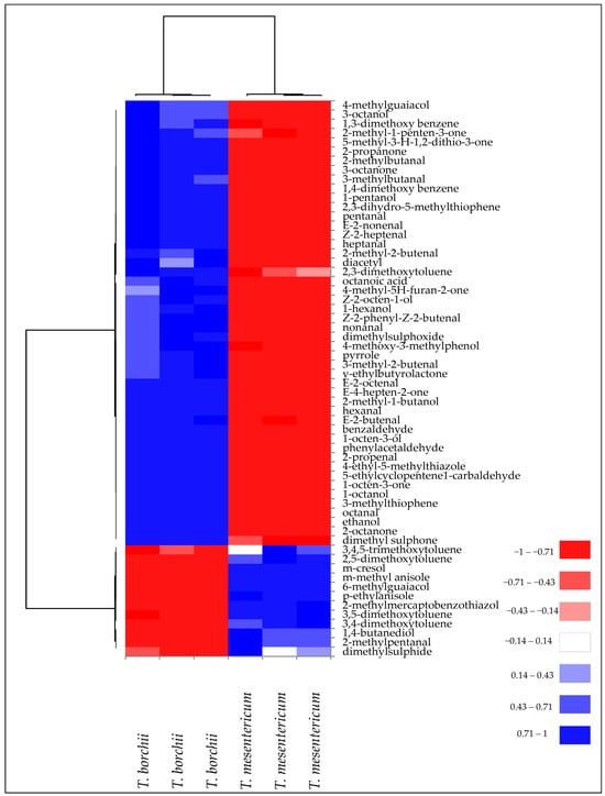 Heatmap of significantly different (p < 0.05) volatile compounds of T. borchii and T. mesentericum samples. Volatile compounds were plotted on the Y axis, while the X axis had the samples. Results are displayed as negative (−1) to positive (+1) correlation of the volatile compounds in the permuted matrix for the respective truffle samples.