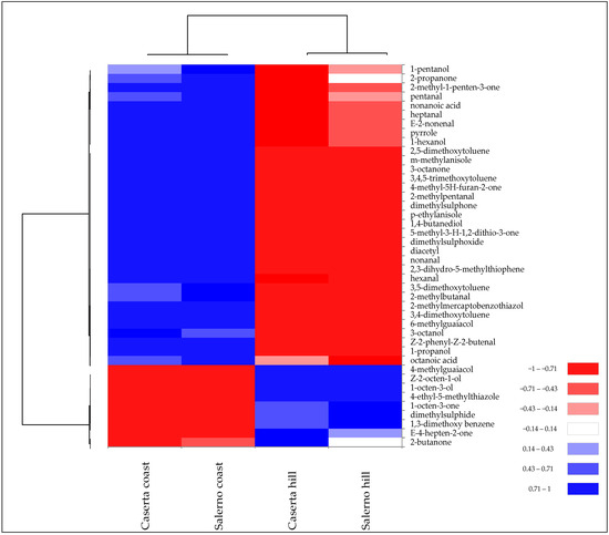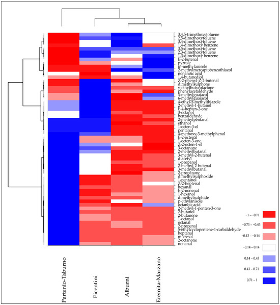 Heatmap of significantly different (p < 0.05) volatile compounds of T. mesentericum samples harvested in different areas of Campania region. Volatile compounds were plotted on the Y axis, while the X axis had the samples. Results are displayed as negative (−1) to positive (+1) correlation of the volatile compounds in the permuted matrix for the respective samples.