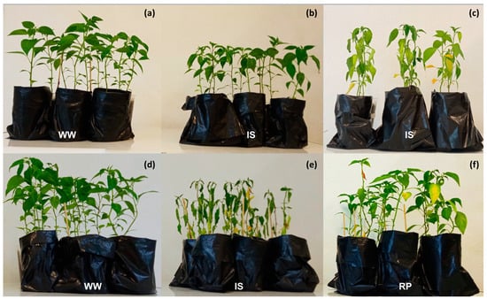 Behavior of Siete Caldos chili plants at different times of exposure to drought stress. (a) Control irrigation on day 8 (WW); (b) Eight days without irrigation (IS); (c) 10 days without irrigation; (d) 14 days WW control; (e) 14 days IS; (f) Plant recovery 24 h after rehydration, day 15 (RP), number of experimental units = 22.