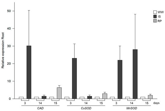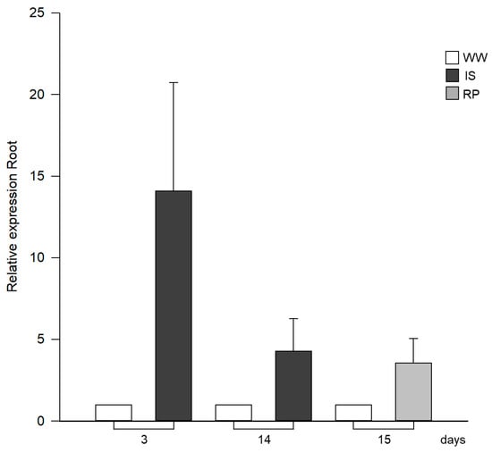 The expression of the CAT gene increased in the roots of the plants exposed to stress on the third day compared to the controls. However, a decrease in gene expression was observed at day 14 in the drought-exposed plants, although it was still approximately 0.4 times greater than in the control plants at day 14. It should be noted that 24 h after rehydration, the expression was upregulated, approximately 5.40 times higher than in the control plants (Figure 2).