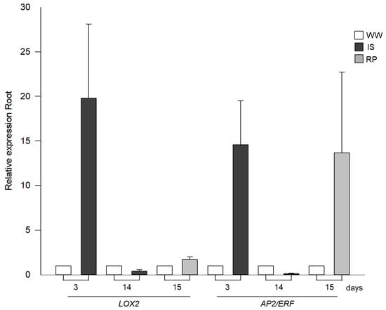 Relative expression profiles by RT-qPCR of genes related to AP2/ERF and LOX2 in roots of drought-exposed Siete Caldos chili pepper plants.