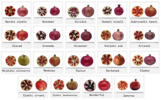 The evaluation was carried out on fruit samples from nineteen cultivars, consisting of sixteen native pomegranate cultivars traditionally grown on the eastern Adriatic coast (‘Barski slatki’, ‘Bokežan’, ‘Dividiš’, ‘Domaći kiseli’, ‘Dubrovački kasni’, ‘Glavaš’, ‘Konjski zub’, ‘Kristal’, ‘Medunac’, ‘Mojdiški sitnozrni’, ‘Pastun’, ‘Sladun’, ‘Slatki crveni’, ‘Slatki tankokorac’, ‘Šerbetaš’, and ’Zamorac’) and three introduced cultivars (‘Granada’, ‘Hicaznar’, and ‘Wonderful’). The native cultivars were collected along the eastern Adriatic coast, propagated by cuttings, and planted in 2011 in the Gene Bank of Mediterranean Fruit Species located at the Institute for Adriatic Crops and Karst Reclamation, Split, Croatia (43°30′22′′ N; 16°29′47′′ E; 60 m a.s.l.). The trees were healthy and bush-shaped with three to four main trunks, planted 4.5 × 3 m apart. The orchard was drip-irrigated and the usual cultivation practices were applied (pruning, fertilization, and plant protection).