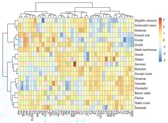 Clustering of pomegranate cultivars based on the morphological parameters of the tree, leaf, flower, fruit, aril, and seed, as well as the chemical parameters of the juice. The rows of the diagram represent the cultivars and the columns denote the analyzed characteristics. For the abbreviations of the analyzed traits, see Table 1, Table 3, Table 4, Table 5, Table 6, Table 7, Table 8, Table 9 and Table 10. In addition, the color parameters obtained from the CIE L*a*b* method are represented by the letters L*, a*, b* C*, and hᵒ located behind the label representing the object of analysis, i.e., fruit (F), aril (A) or juice (J). The colors of the cells of the heatmap indicate low (dark blue), medium (white), and high (dark red) values of a particular trait.