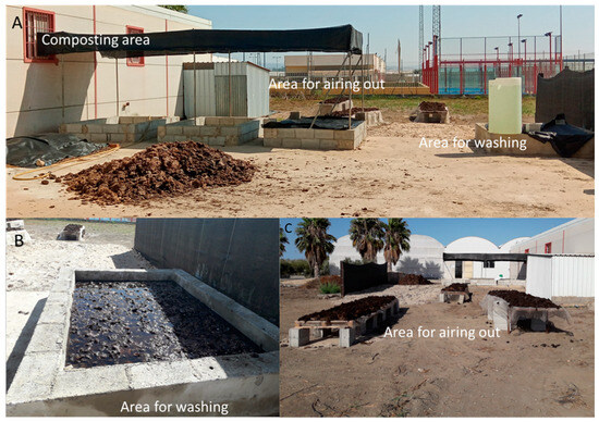 To establish the pre-treatment and composting process (Figure 1), a 200 m2 plot of land was prepared at the IFAPA experimental farm in La Cañada (SE Spain 36°49′58.860″ N, 2°24′7.351″ W). For experiment 1 (2020–2021), the treatments were divided into three piles, and for experiment 2 (2021–2022), into four piles, on a concrete surface with the infrastructure illustrated in Figure 1. In the algae washing process used during experiment 1, a washing pond and open-air drying tables were utilized (see Figure 2).