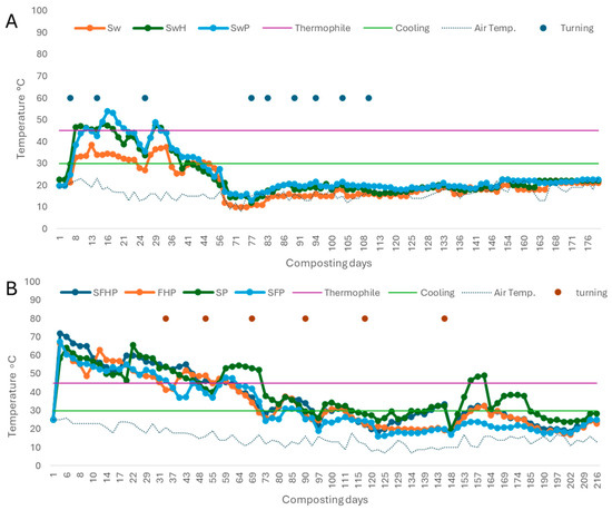 Changes in the mean values of temperature using washed seaweed (A) and unwashed seaweed (B) during the composting process. Sw: 100% washed seaweed; SwH: 33% washed seaweed + 67% horticultural waste; SwP: 33% washed seaweed + 67% gardening pruning; SFHP: 15% seaweed + 15% fruit + 30% horticultural waste + 40% gardening pruning; FHP: 20% fruit + 40% horticultural waste + 4 0% gardening pruning; SP: 35% seaweed + 65% gardening pruning; and SFP: 30% seaweed + 20% fruit + 50% gardening pruning. Thermophile: minimum thermophile phase (45 °C); cooling: minimum cooling phase (30 °C).