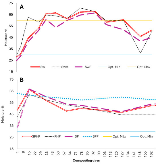 Changes in the mean values of moisture with washed seaweed (A) and unwashed seaweed (B) during the composting process. Sw: 100% washed seaweed; SwH: 33% washed seaweed + 67% horticultural waste; SwP: 33% washed seaweed + 67% gardening pruning; SFHP: 15% seaweed + 15% fruit + 30% horticultural waste + 40% gardening pruning; FHP: 20% fruit + 40% horticultural waste + 40% gardening pruning; SP: 35% seaweed + 65% gardening pruning; SFP: 30% seaweed + 20% fruit + 50% gardening pruning. Opt. Max.: optimum maximum moisture (60%); Opt. Min.: optimum minimum moisture (30%).
