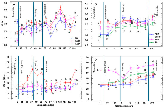 Mean values of pH (A,B) and EC (C,D) with washed seaweed and unwashed seaweed during the composting process. All parameters show significant differences, as their values were p < 0.05 using the one-way ANOVA test. The letters between the same day of composting correspond to the multiple range test and LSD test at the 95% confidence level. The bars in the graph represent the standard deviation. Sw: 100% washed seaweed; SwH: 33% washed seaweed + 67% horticultural waste; SwP: 33% washed seaweed + 67% gardening pruning; SFHP: 15% seaweed + 15% fruit + 30% horticultural waste + 40% gardening pruning; FHP: 20% fruit + 40% horticultural waste + 40% gardening pruning; SP: 35% seaweed + 65% gardening pruning; and SFP: 30% seaweed + 20% fruit + 50% gardening pruning.