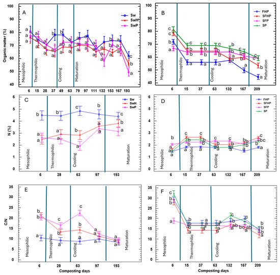 Mean values of organic matter (A,B), total nitrogen (C,D) and relation C/N (E,F) with washed seaweed and unwashed seaweed during the composting process. All parameters show significant differences, as their values were p < 0.05 using the one-way ANOVA test. The letters between the same day of composting correspond to the multiple range test and LSD test at the 95% confidence level. The bars in the graph represent the standard deviation. Sw: 100% washed seaweed; SwH: 33% washed seaweed + 67% horticultural waste; SwP: 33% washed seaweed + 67% gardening pruning; SFHP: 15% seaweed + 15% fruit + 30% horticultural waste + 40% gardening pruning; FHP: 20% fruit + 40% horticultural waste + 40% gardening pruning; SP: 35% seaweed + 65% gardening pruning; and SFP: 30% seaweed + 20% fruit + 50% gardening pruning.