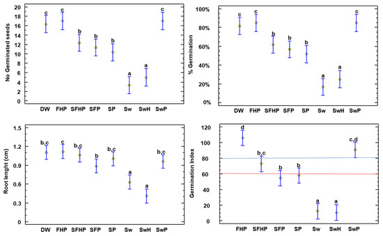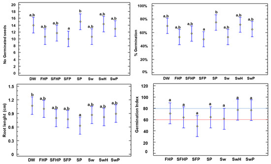 Germination bioassays are used to evaluate the salinity, toxic substances, soil pathogens, and some physical and chemical properties of compost [63]. The germination index was measured using the method of Zucconi et al. [64]. For each of the composts, a 1/10 dilution of the saturated extract with distilled water was used. For the control, distilled water was used with three replicates for one of two species. Subsequently, three replicates were carried out for each of the treatments in Petri dishes with filter paper and with 20 seeds of two species: cress and lettuce. At 48 h after sowing (or incubation), the number of germinated seeds and root length were assessed, and the average root length and germination percentage were calculated for three replicates. The root length was measured using a ruler. These measurement values were used to calculate the germination index (GI) [64]. The GI is a rapid and reliable method to test the phytotoxicity of compost, quantifying the effect of the water extract on plant growth. Compost is not phytotoxic when the germination index exceeds 60 [65]. The formula was as follows:
