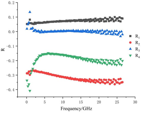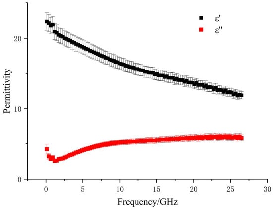 The dielectric parameters (ε′ and ε″) were measured using a vector network analyzer (3671D, Kesiyi Science and Technology Co., Ltd. of China Electric Equipment Group, Qingdao, China; Figure 1). Specifically, ε′ refers to the dielectric media’s capacity to store an electric field energy, and ε″ reflects the energy lost from the dielectric media in an alternating electric field [,]. Before the test, the vector network analyzer and coaxial probe were preheated for 1 h and connected through a coaxial cable. Later, they were calibrated with an open circuit, short circuit, and loading standard components. Finally, the measurement frequency range was set from 0.1 to 26.5 GHz. A total of 100 frequency points were chosen for measurement by using the method of equally spaced measurements in a logarithmic coordinate system.