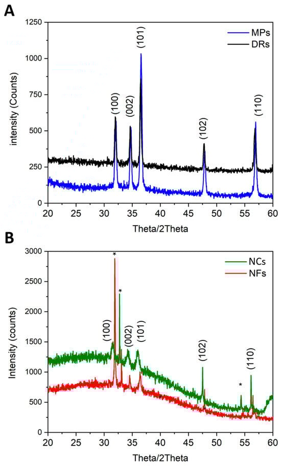 X-ray diffraction patterns of (A) micro-sized particles, i.e., DRs and MPs, and (B) nano-sized particles, i.e., NCs and NFs. The diffraction peaks are indexes with Miller indexes according to the wurtzite structure of ZnO. Asterisks * refer to the underlying silicon wafer substrate.