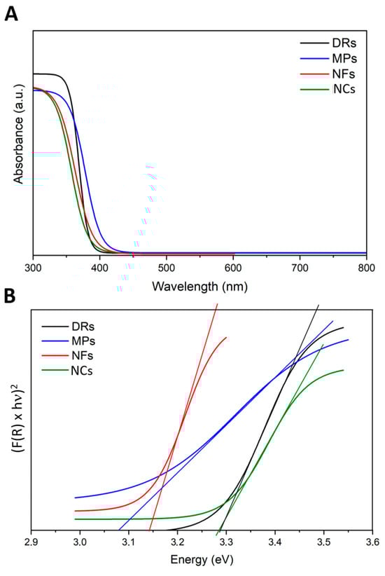 (A) UV-visible absorption spectra and (B) Tauc plots related to the four ZnO particle morphologies: Desert Roses (DRs) in black; MultiPods (MPs) in blue; NanoFlakes (NFs) in red; NanoCrystals (NCs) in green.