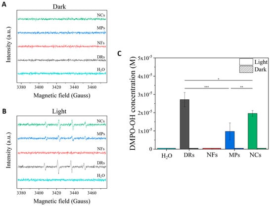 EPR (Electron Paramagnetic Resonance) spectra obtained by exposing the different ZnO particles to (A) dark and (B) light irradiation conditions (395 W m−2 for 10 min of white light). Spectra were recorded adopting the spin-trap technique and using the DMPO trap; thus, DMPO-OH adduct signals derived from the production of OH radicals were mainly recorded. (C) Bar graph comparing the DMPO-OH concentrations obtained from the different ZnO particles excited under light irradiation or dark. The statistical relevance is provided (* p < 0.05; ** p < 0.01; *** p < 0.001).