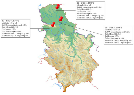 Soil samples for analysis were taken from the top layer (0–30 cm) in the first year of investigation, in spring before the experiment setup. The content of CaCO3 in soil was determined by a volumetric method using a Scheibler calcimeter (Gabbrielli Technology srl, Calenzano (FI)—Italy) [55]. The northern location (L2) belongs to the group of low-carbonate soil (2.0% CaCO3), while the other two locations (L1 and L3) belong to the medium carbonate soil type (8.4% and 8.8%, respectively). Soil pH value was determined potentiometrically in KCl suspensions using an electronic pH meter (Cole-Parmer Instrument Co Ltd, Saint Neots, UK) [56]. All soils were neutral to slightly alkaline (pH between 7.1 and 7.3). Humus content was determined by the Tjurin method [57]. In all three locations, the humus content varied from 2.2 to 2.7%. The total nitrogen content was determined according to the Kjeldahl method [58], and varied between 0.14 and 0.18%. Available phosphorous and potassium were determined by the Al method [59]. Locations L2 and L3 were optimally provided with these two macro-elements, while at location L1, the provision was very high. These differences can be related to the previous crops: L1 alfalfa, L2 soybeans, and L3 corn. In addition, organic fertilizers (cow manure) were applied to L1 and L2, while location L3 was fertilized with chemical NPK fertilizers.